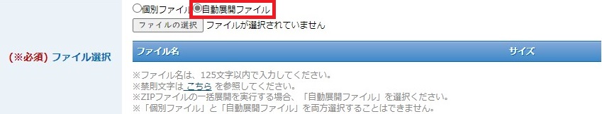 なお、アップロードするファイルが複数ある場合、ZIPファイルに圧縮し「自動展開ファイル」を選択してアップロードをご利用ください。